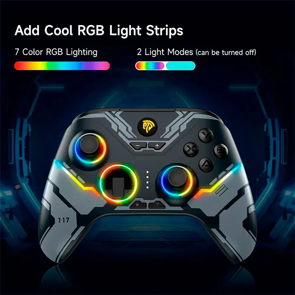 EasySMX X15 er en højtydende gamepad, der kombinerer RGB-belysningseffekter for et personligt spilmiljø og overlegen præcision takket være den dobbelte Hall-sensor.