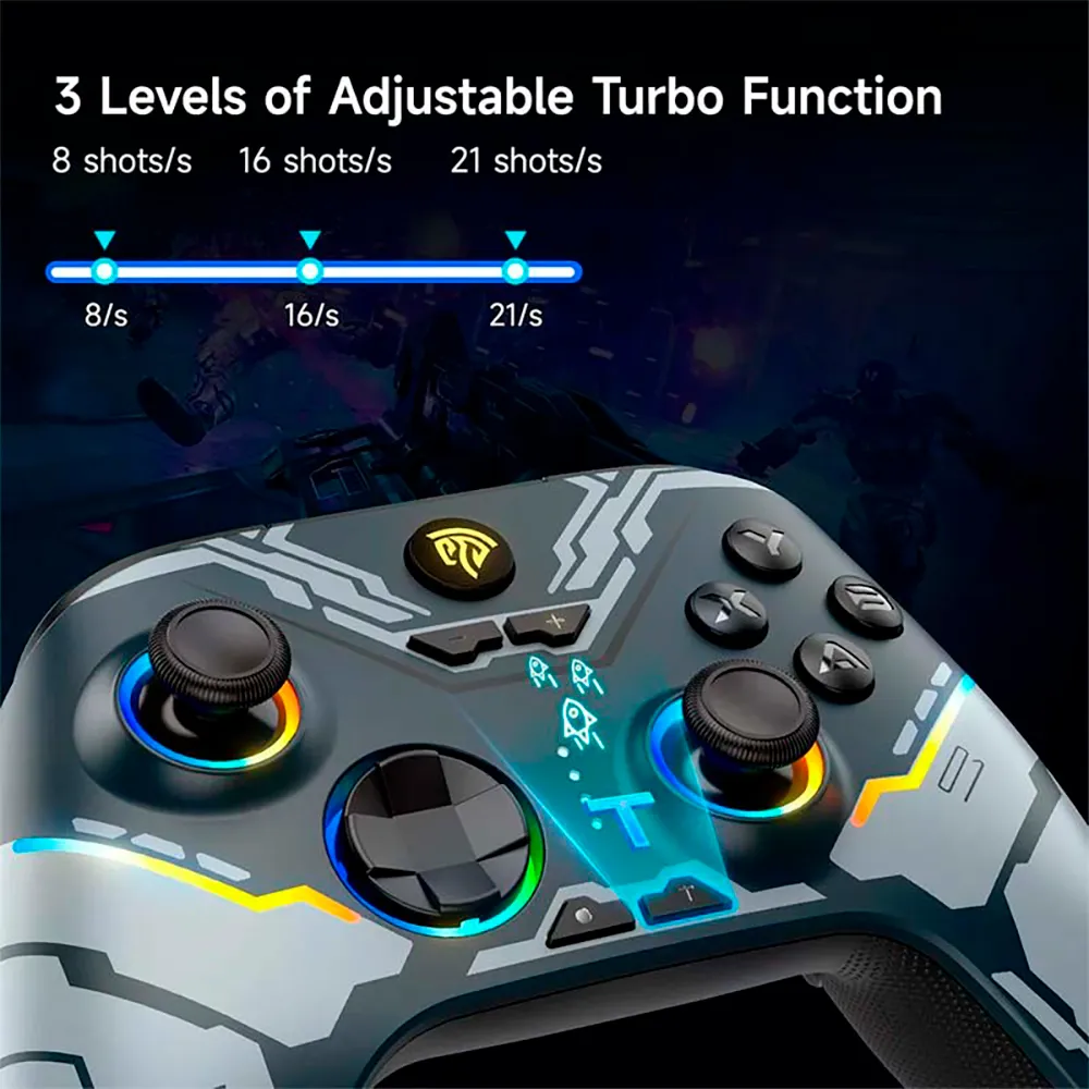 Derudover har controlleren 3 niveauer af justerbar vibrationsfeedback og en Turbo-funktion med 3 niveauer af tilpasning, hvilket giver en personlig spiloplevelse til hver spillers præferencer.