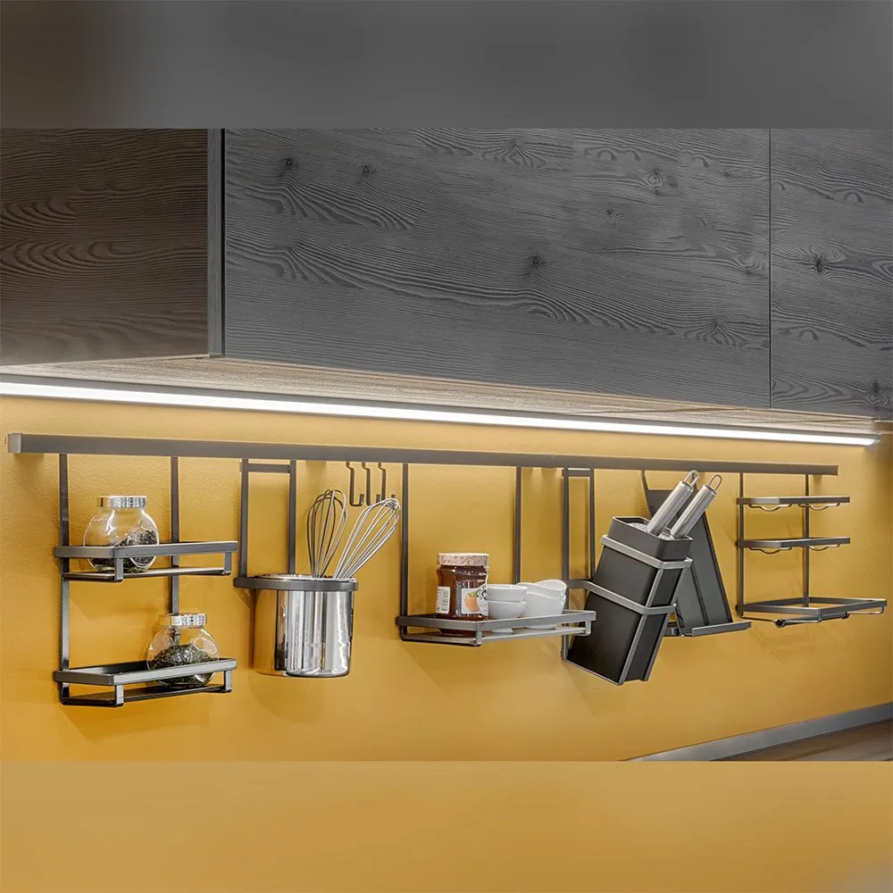 Udvalg af tilbehør til montering på din køkkenvæg. Nu vil du have alle dine værktøjer ved hånden og mere plads på køkkenbordet til at arbejde, som om du var i en stor restaurant. Det elegante design i antracitgrå og den flade stålstruktur er de nyeste tendenser inden for køkkendesign. Karakteriseret ved at være hængt fra en aluminiumsprofil monteret på væggen med skjulte støtter. De forskellige tilbehør hænger fra bagsiden af profilen og giver et rent udseende. Der er forskellige tilbehør til rådighed med deres optimerede dimensioner for at udnytte deres opbevaringskapacitet mest muligt. Det brede sortiment omfatter bestikholdere, krydderiholdere og hængende kroge. Der er også en praktisk rulleholder til køkkenpapir, husholdningsfilm og aluminiumsfolie, en forkromet bestikholder, knivholder og en tabletholder til at følge opskrifter på en nem og sikker måde i køkkenet.