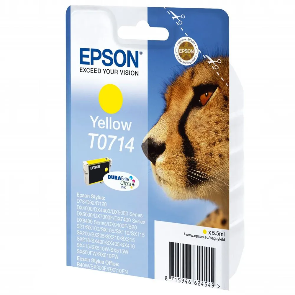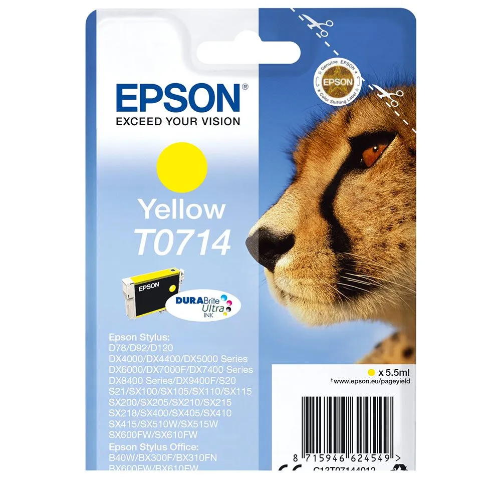 Slip din Epson-printer fulde potentiale løs med den originale Epson T0714 Gule Blækpatron. Som en vital komponent i dine kontorartikler er denne blækpatron af høj kvalitet designet til at levere konsekvente, pålidelige og professionelle resultater med hvert print. Som en del af Epsons anerkendte "Cheetah" blækserie er T0714-patronen fyldt med innovativ Epson DURABrite™ Ultra Blæk, der sætter en ny standard for printkvalitet og holdbarhed for alle dine dokumenter og fotos.