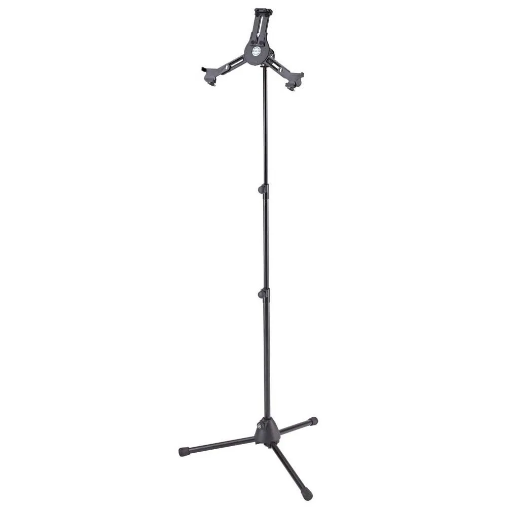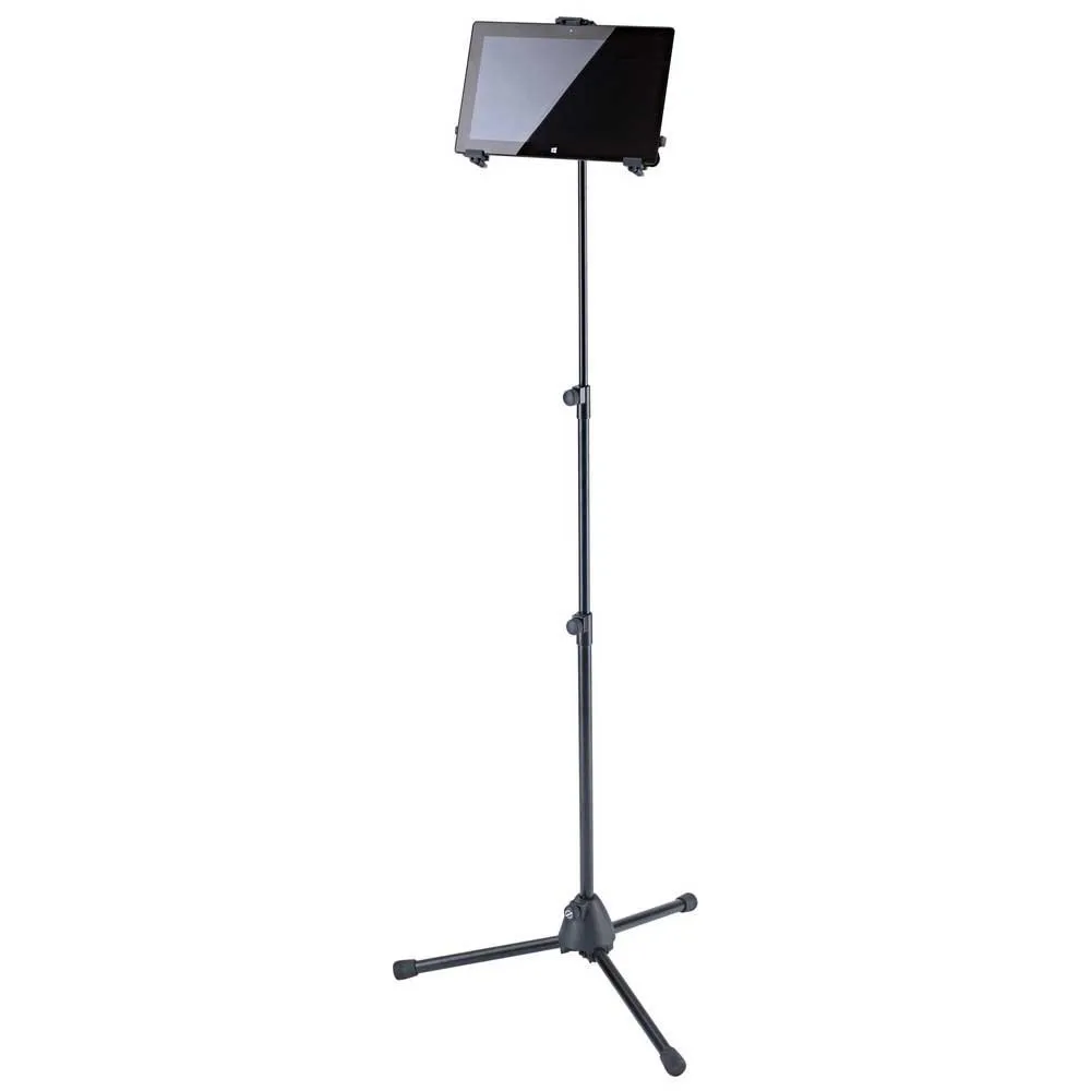 Kombinationen af stativet og Universal Tablet Holder understøtter dig på scenen, derhjemme eller i studiet. De individuelt justerbare støttearme kan rumme brugen af tablets i højden fra 222 til 334 mm og bredde fra 128 til 232 mm (for eksempel iPad, iPad Air, iPad Pro, Amazon Fire HDX 8.9, Samsung Galaxy Tab fra 9.7, Google Nexus 9, Asus Transformer eller Microsoft Surface samt Surface Pro). Tabletternes dybde kan variere mellem 6 og 11 mm. Ved første brug af tabletholderen foretages indstillingerne af bærearmene ved at justere klemmeskruerne til størrelsen og dybden af tabletten. Til andre anvendelser kan tabletten fastgøres og løsnes hurtigt og simpelt gennem en snaplås. En praktisk vingemøtrik gør det muligt at justere vinklen, så hver bruger let kan finde deres ideelle individuelle position. Tabletten kan skifte mellem stående og liggende position. Tabletten holdes på plads, og der er ingen fare for, at tabletten skifter position i sig selv. Det lette og udvidelige stativ kan justeres til enhver højde mellem 70 og 155 cm. Et lille og kompakt fodaftryk gør dette stativ let at transportere.