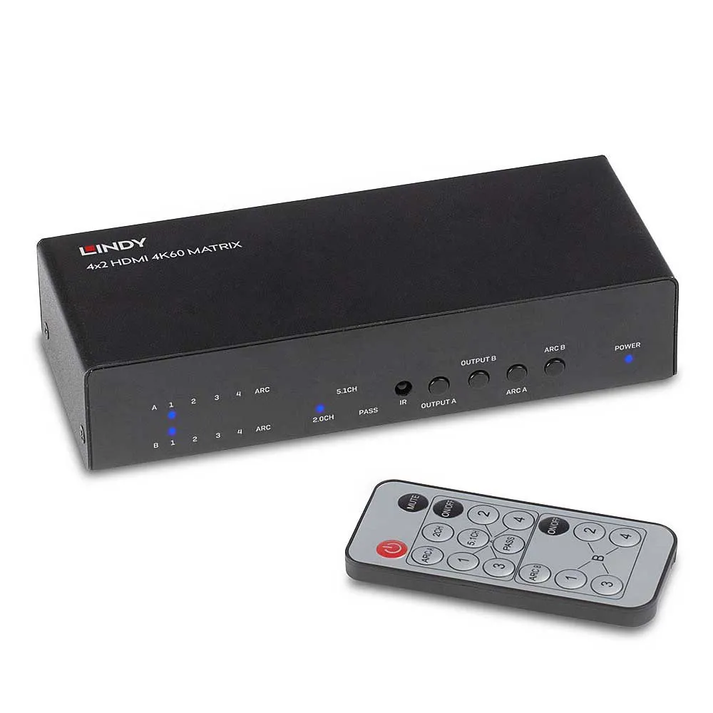 Lindy 4x2 HDMI 4K60 Matrix Switch er en højtydende løsning til distribution af indhold fra flere kildeenheder til to skærme.