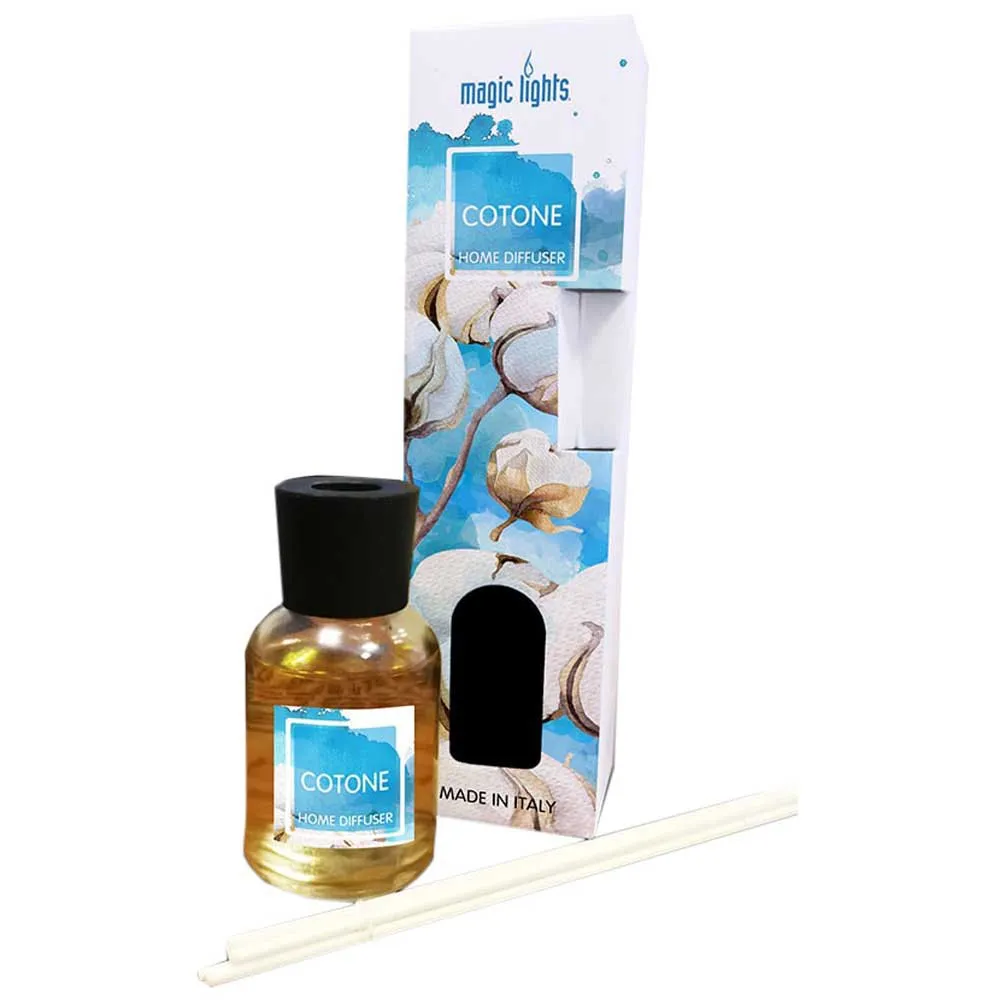 MAGIC LIGHTS Mikado Diffuser i Cotton tilbyder en ren, frisk og beroligende duft, der minder om nyvasket linned, der tørrer i en varm sommerbrise. Denne indbydende duft skaber en følelse af ro og fred, perfekt til at slappe af efter en lang dag eller skabe en indbydende atmosfære for gæster. De subtile, men fængslende noter af bomuldsblomst blandes harmonisk for at skabe en virkelig indbydende og afslappende stemning.