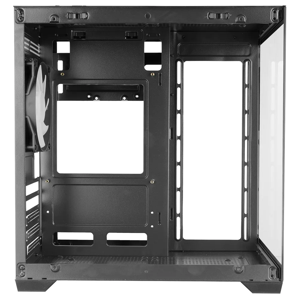 Dens kontinuerlige hærdede glas på front- og sidepaneler giver et panoramaudsigt over interiøret og fremviser hver komponent med en fejlfri æstetik.
