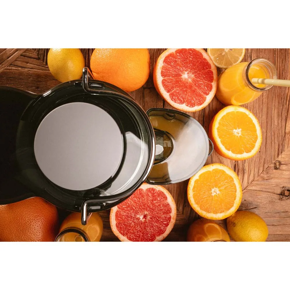 Juicebeholderen med en kapacitet på 0.45L er udstyret med et låg for at forhindre ukontrolleret sprøjt af juicen.