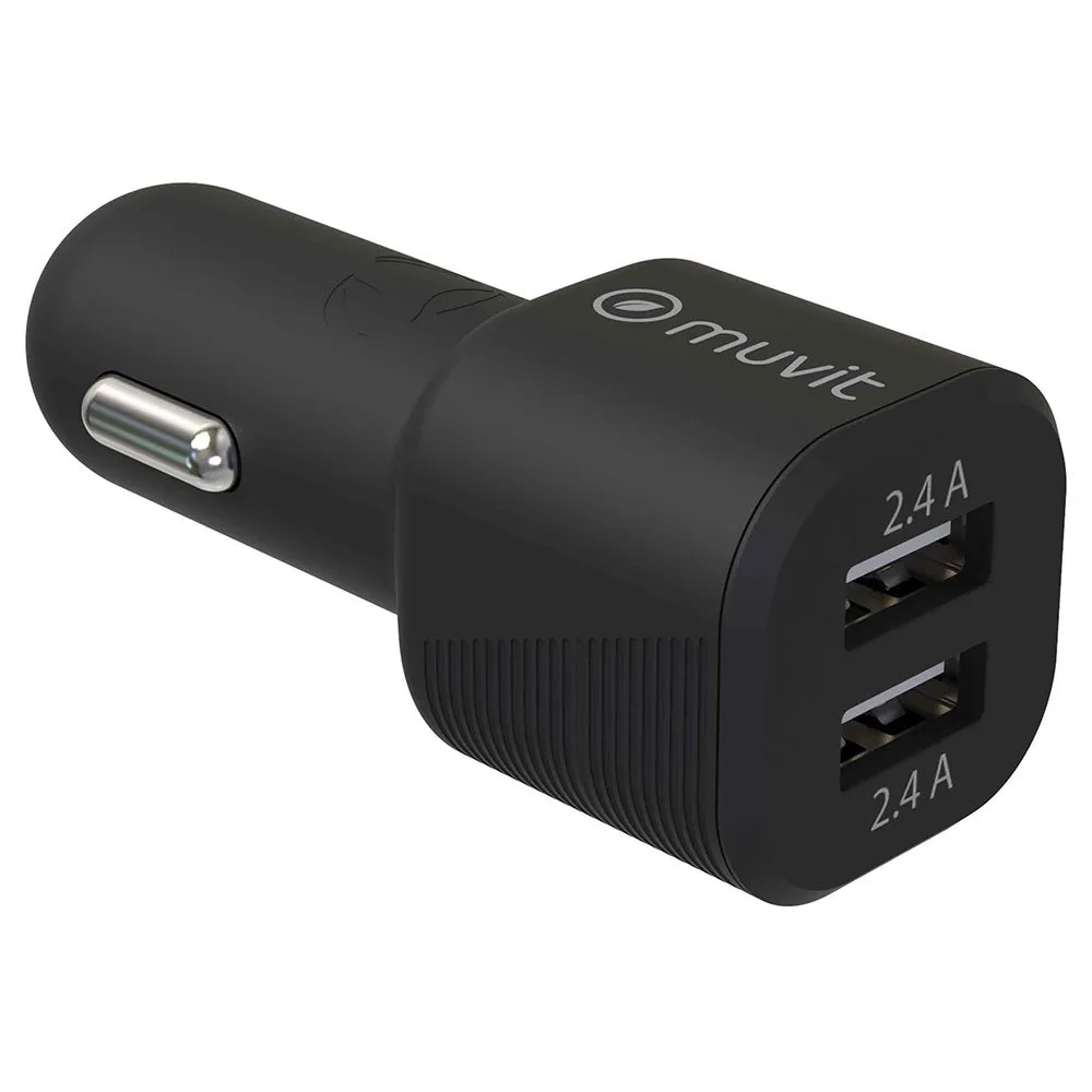 Biloplader fra muvit for change, med 2 USB-porte, 4.8A / 24W, i sort farve.