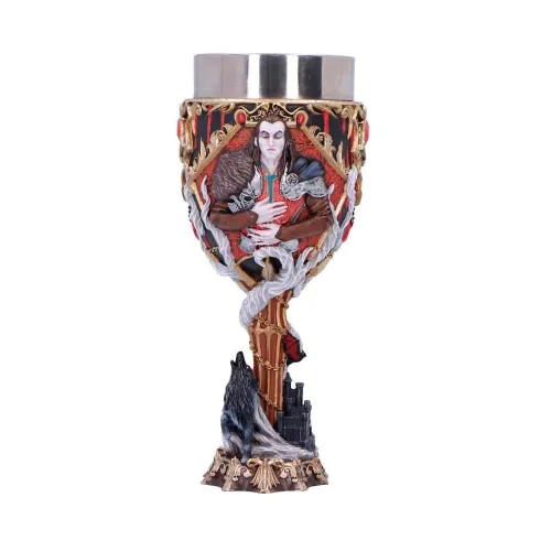 Denne mesterligt skulpturerede pokal fanger den mørke, gotiske essens af Castle Ravenloft. Bægeret er prydet med Strahds kongelige og ildevarslende våbenskjold, flankeret af indviklede vampyrflagermusvinger, der synes at omslutte karret. En slående, blodrød ædelsten er sat i midten, der symboliserer vampyrens ældgamle kraft og umættelige tørst. Stilken er et kunstværk i sig selv, udformet til at ligne en skeletagtig, kloagtig hånd, der rækker op fra graven for at præsentere kalken. Hver kurve og detalje er omhyggeligt håndmalet, hvilket sikrer, at hver pokal er et unikt samlerobjekt med en uovertruffen finish, der fremhæver dets dystre og herlige design.
