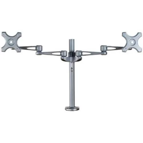 NewStar skrivebordsbeslag, model FPMA D935D er et vippeligt, drejeligt og drejeligt bordbeslag til 2 fladskærme op til 27 ”. Denne holder er et godt valg til pladsbesparende placering på skriveborde ved hjælp af en bordklemme.