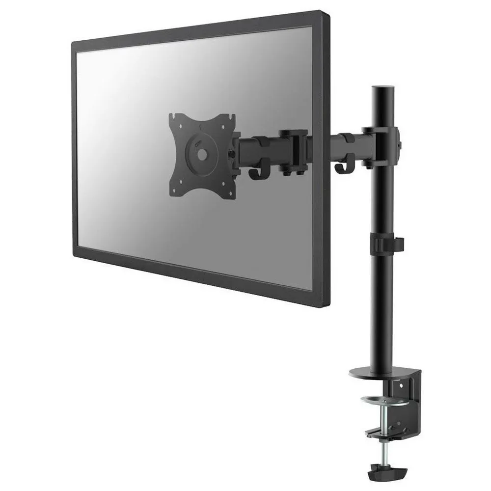 NewStar skrivebordsbeslag, model NM D135BLACK, er et vipbart, drejeligt og drejeligt bordbeslag til fladskærme op til 27 ”. Dette beslag er et godt valg til pladsbesparende placering på skriveborde ved hjælp af en bordklemme eller gennemføring.