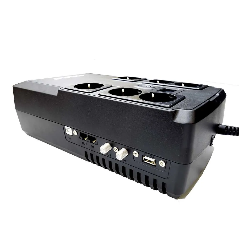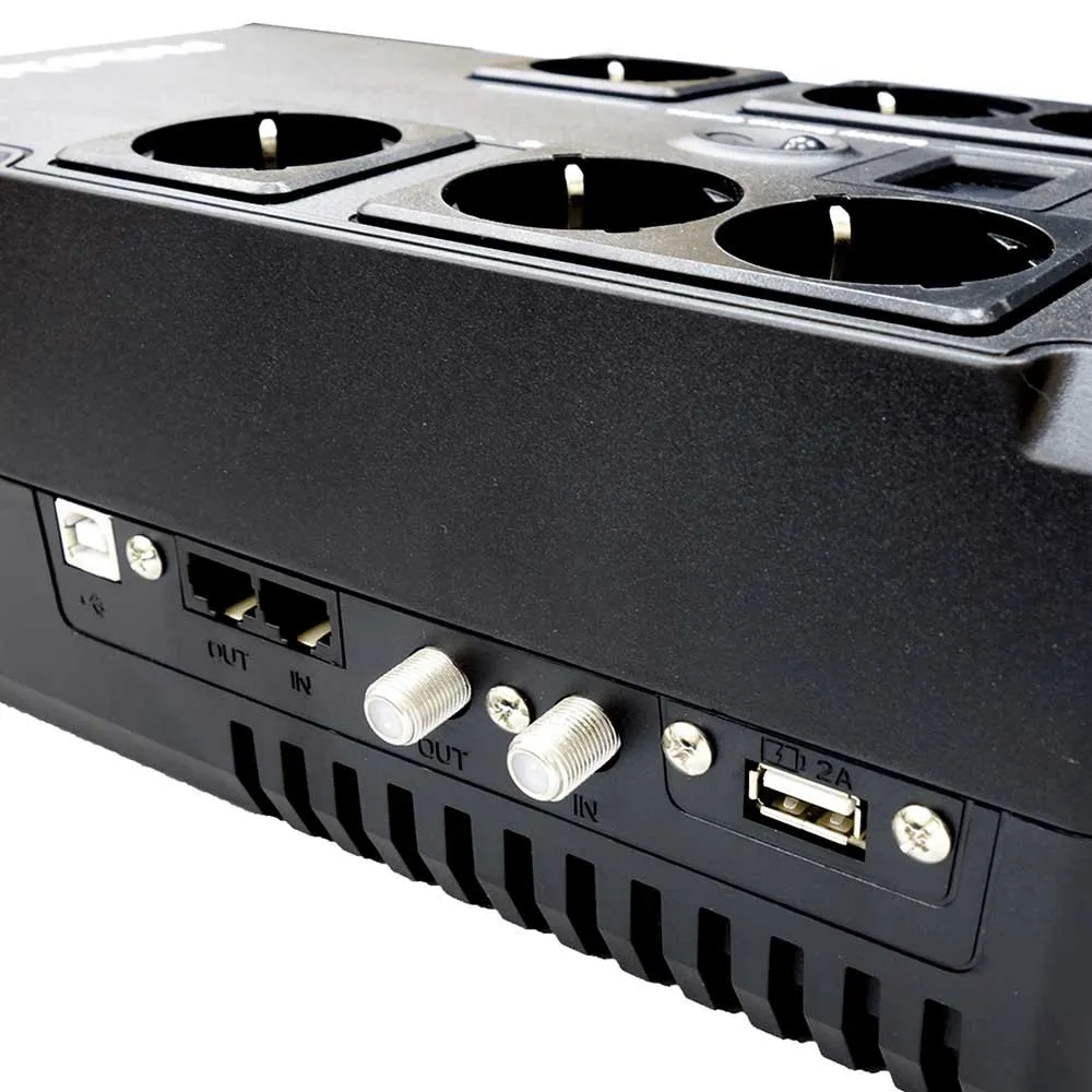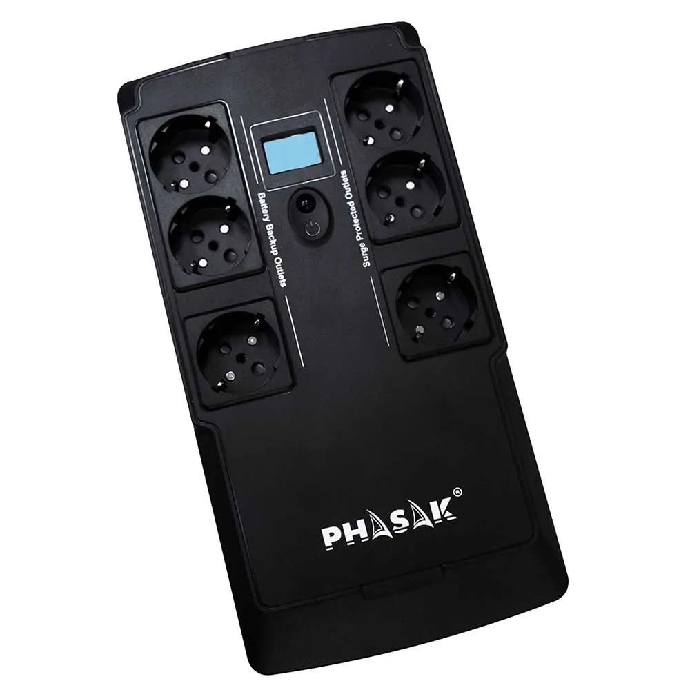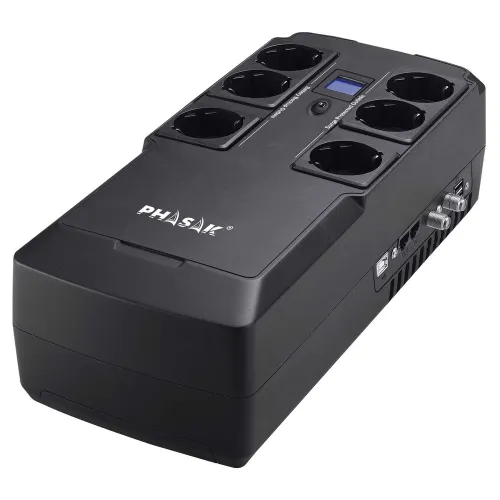 PHASAK PH 9478 800VA UPS tilbyder en robust 800VA/480W kapacitet, der giver rigelig backup-strøm til at holde vigtige enheder kørende under strømafbrydelser.