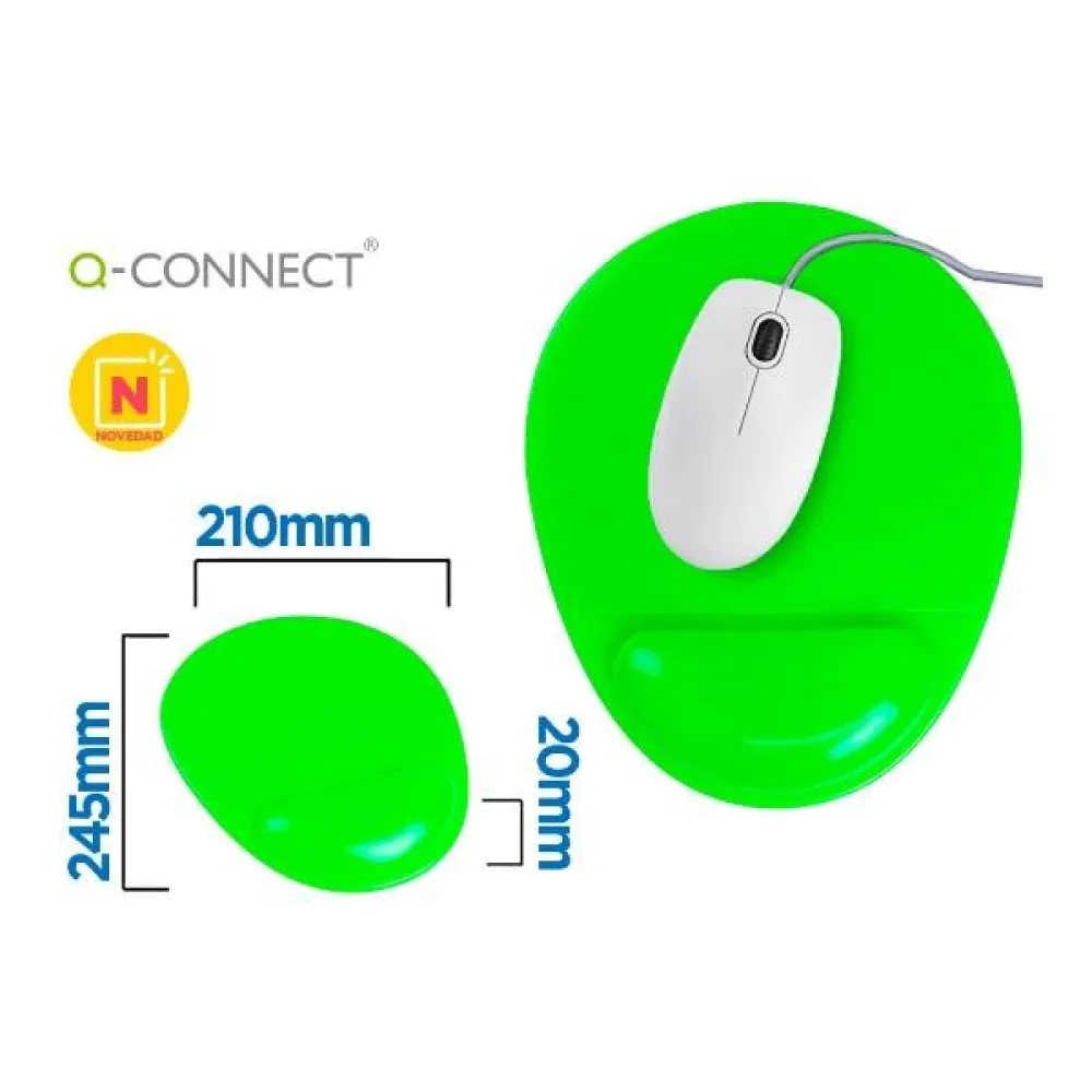 Q-connect musemåtte med gel håndledsstøtte, PVC, grøn farve, 210x245x20 mm. PVC musemåtte med gel håndledsstøtte. Musemåtte med en specielt designet overflade for at forbedre optisk musbevægelsesgenkendelse. Ergonomisk design og skridsikker bund. Levende farver.