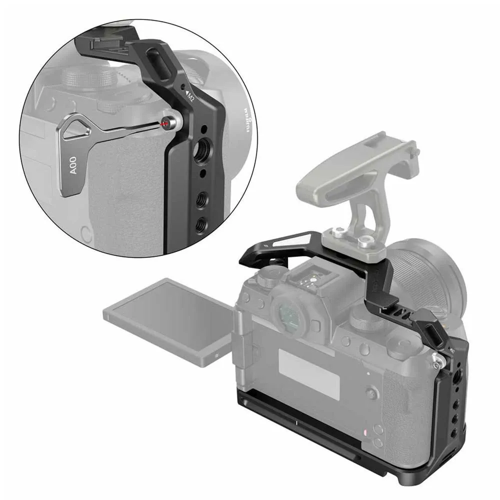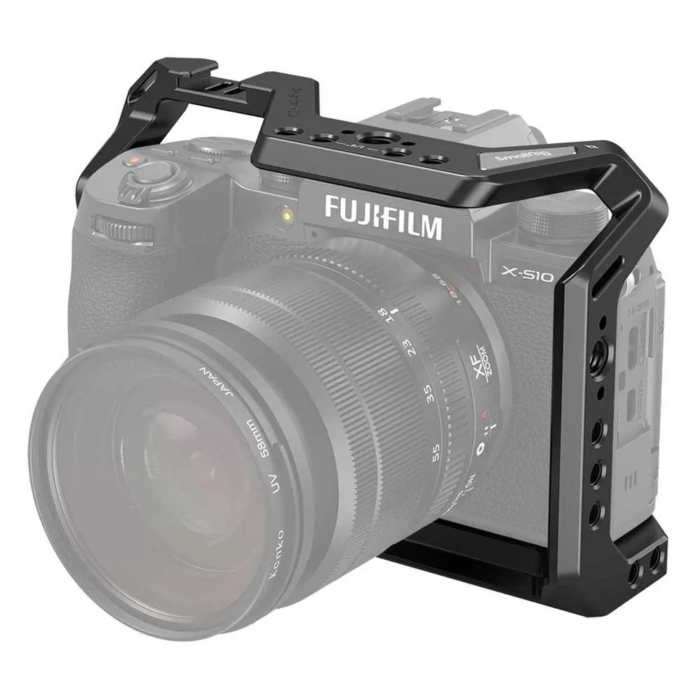 SmallRig Cage til FUJIFILM X S10 Camera 3087 er et formtilpasset fuldt bur designet til at give beskyttelse og tilbehørsbeslag. Buret fastgøres til kameraet via en 1/4´´ 20 skrue i bunden og en m2 skrue på højre side for yderligere sikkerhed for at forhindre vridning. Med flere 1/4´´ 20 og ARRI 3/8´´ 16 tilbehørsgevind til tilbehør, såsom sidehåndtag HSN2093, Cold Shoe 2260, Monitor Mount 2903 og Top Handle 2165. Buret integreres med en koldsko på toppen til mikrofonen og lyset. Bunden leveres med 1/4´´ 20 og 3/8´´ 16 gevind til at fastgøre en kameraplade, såsom Manfrotto Plate 1280 og APU2458. En flad skruetrækker med en unbrakonøgle er inkluderet til at fastgøre kameraskruen og opbevares i bunden af buret. Bunden integrerer en Arca Swiss plade, der muliggør montering på et stativhoved. Buret bevarer adgang til alle knapper, LCD-skærm og dummy-batterikabel. Valgfri HDMI-kabelklemme 1679 er tilgængelig separat for at beskytte HDMI-porten.