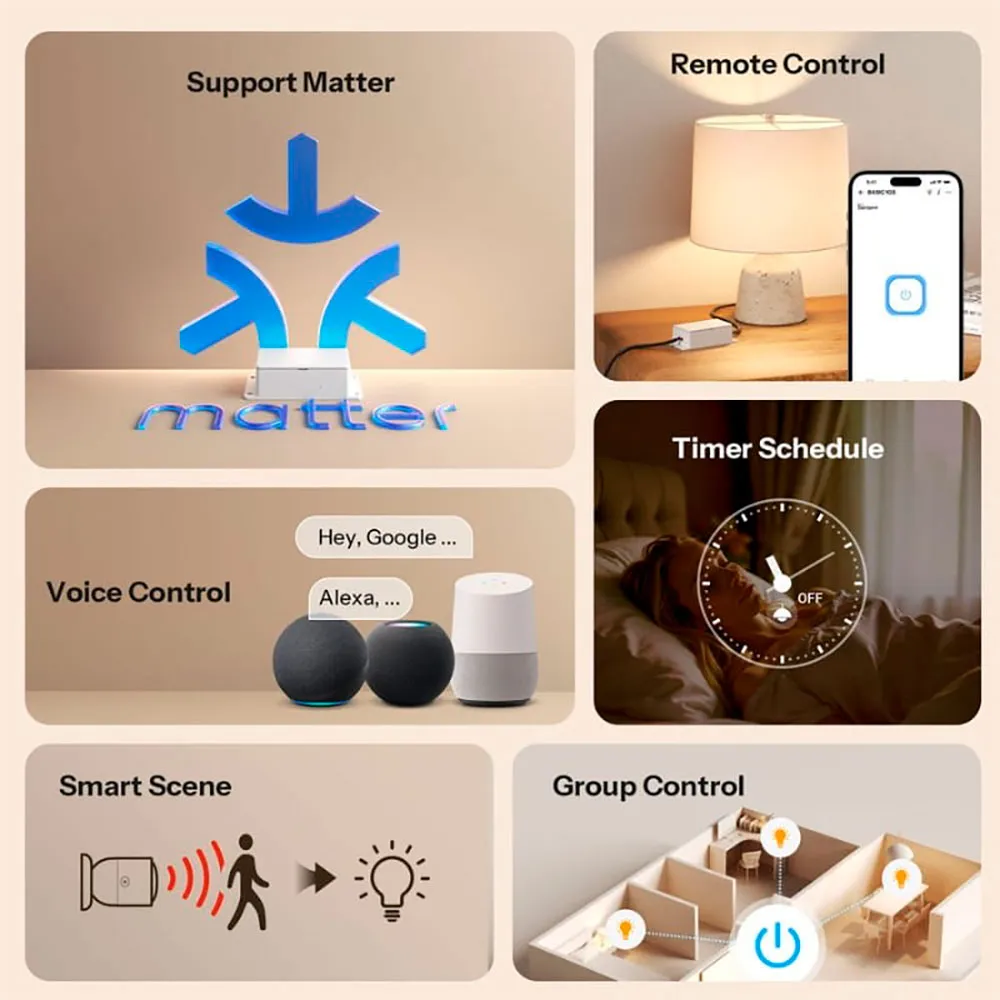 Den tillader timere, nedtællinger og scener fra eWeLink eller enhver Matter-platform, samt stemmekommandoer og udvidede fysiske knapper til praktisk manuel brug.