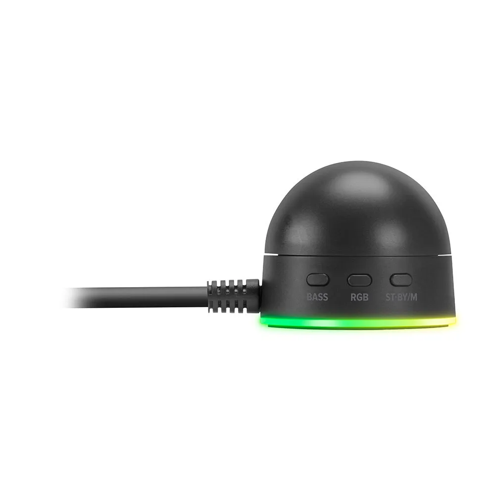 Ultimativ bekvemmelighed: Styr din lyd nemt med den praktiske fjernbetjening til skrivebordet. Juster lydstyrken øjeblikkeligt uden at afbryde dit arbejde eller spil. For finere justering er der yderligere lydstyrke- og baskontroller direkte på subwooferen.