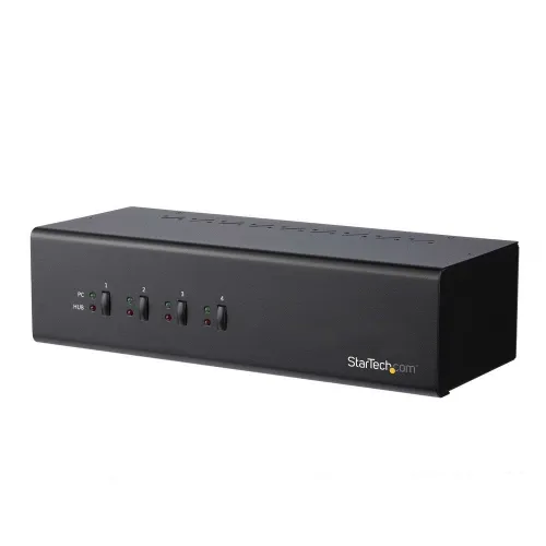 Switchen deler også en mikrofon, et sæt højttalere, et tastatur og en mus på tværs af de fire tilsluttede computere og har en ekstra indbygget USB-hub med 2 porte.