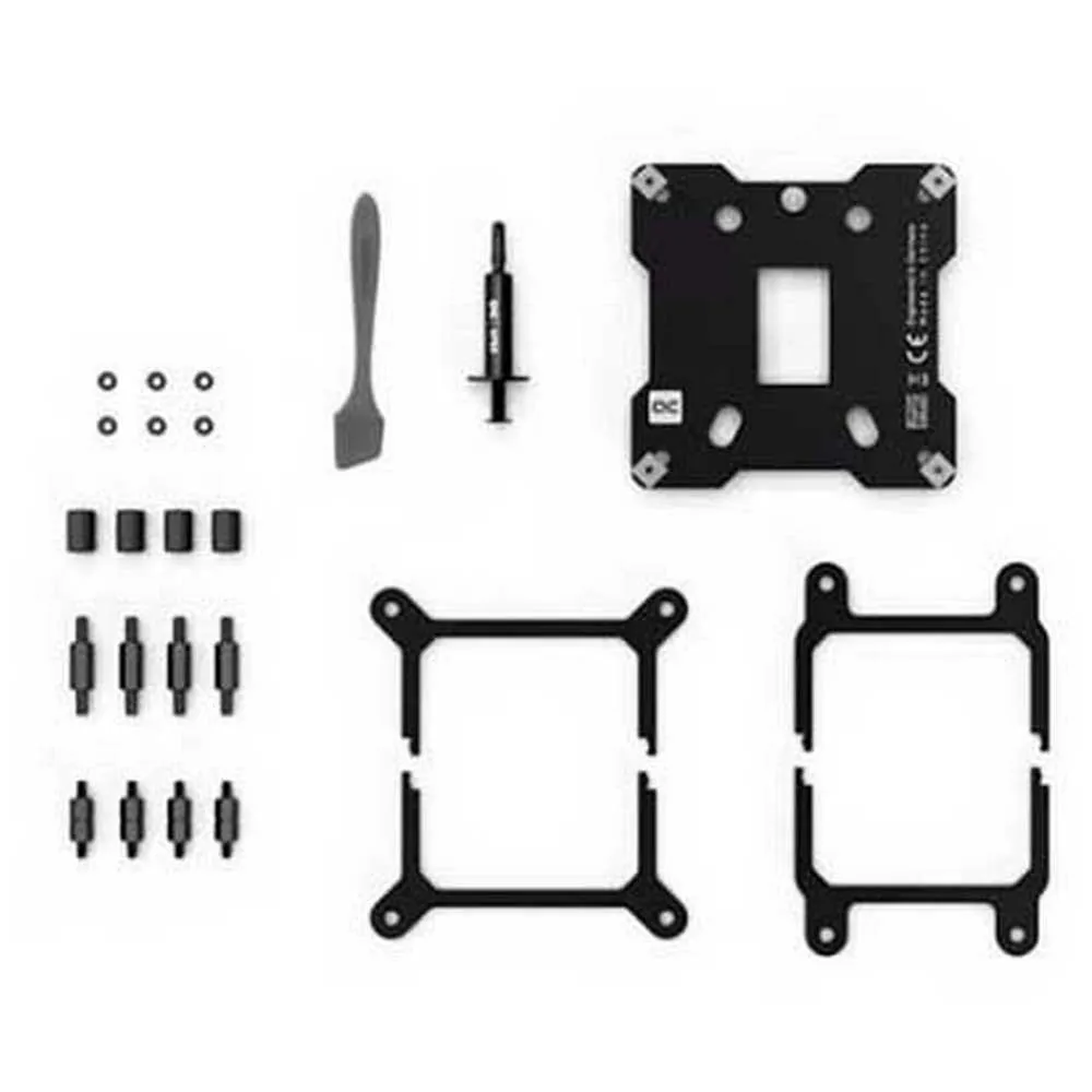 - Auch das Montagesystem wurde überarbeitet. Im Vergleich zu früheren Alphacool-Modellen benötigt es weniger Schrauben. Zunächst wird die Backplate (Intel) mit vier Abstandshaltern vormontiert. Danach wird Wärmeleitpaste auf die CPU aufgetragen. Anschließend wird der entsprechende Montagerahmen auf den CPU-Kühler gelegt und mit vier Muttern an den Abstandshaltern befestigt.