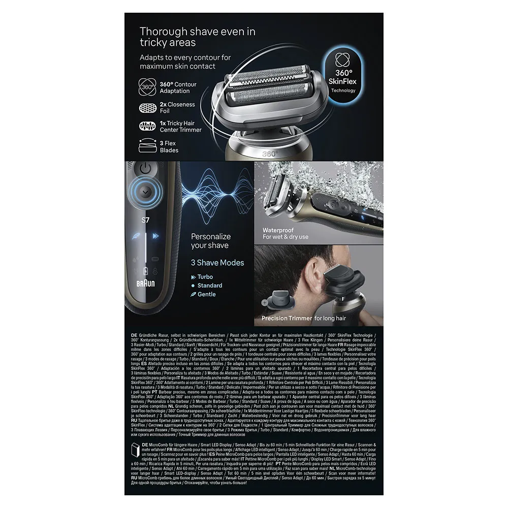 Dieses vielseitige Gerät ist mehr als nur ein Epilierer; es ist ein komplettes Beauty-Set. Die mitgelieferten Aufsätze ermöglichen es Ihnen, Ihre Pflegeroutine individuell anzupassen. Wechseln Sie einfach zum Scherkopf für empfindliche Bereiche oder verwenden Sie die Trimmerkappe, um das Haar für die Epilation vorzubereiten. Mit dem Braun Series 7 haben Sie ein einziges, elegantes Gerät für alle Ihre Enthaarungs- und Pflegebedürfnisse, das bei jeder Anwendung für langanhaltende Glätte und Selbstvertrauen sorgt.