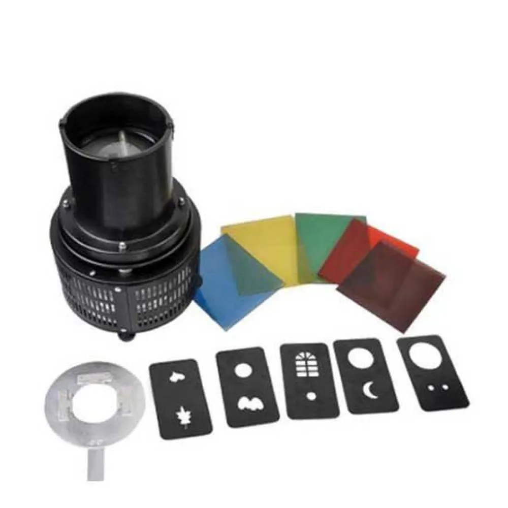 In die Einschuböffnung an der Oberseite des Gehäuses können Metalleffektplatten eingesetzt werden (erhältlich bei Lee Filters, aber Sie können sie auch selbst herstellen). Sie können z. B. kleine Sterne, Herzen, Kreise ausschneiden und auf den Hintergrund projizieren. Lassen Sie Ihrer Kreativität einfach freien Lauf.