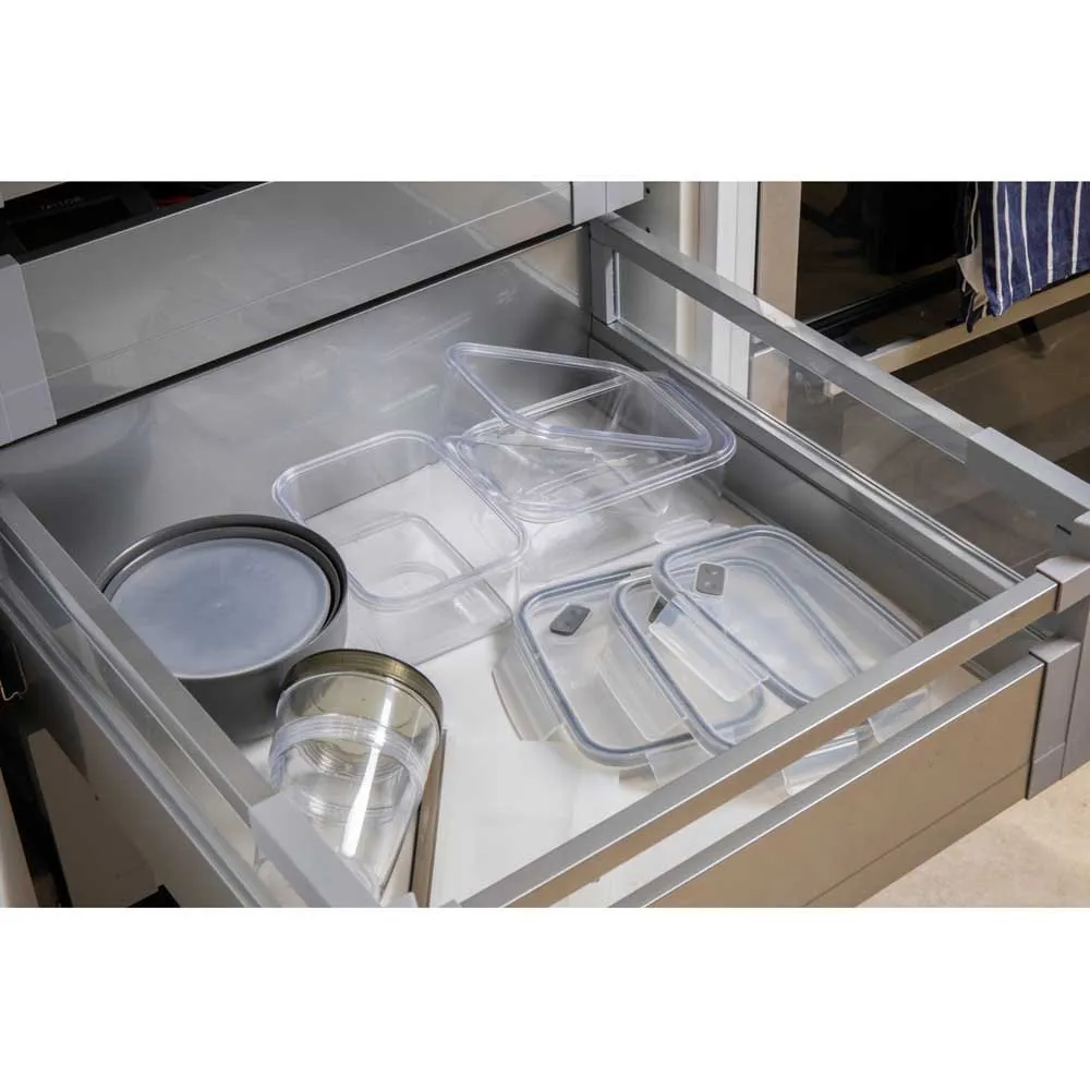 Dank ihres flachen Profils eignet sie sich perfekt zum Platzieren in einer Küchenschublade, einem Schrank oder einer Speisekammer, ohne zu viel Platz einzunehmen.