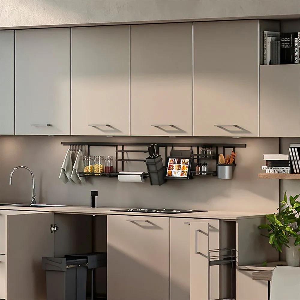 Reihe von Accessoires zur Montage an der Küchenwand. Jetzt haben Sie alle Ihre Werkzeuge griffbereit und mehr Platz auf der Küchentheke, um wie in einem großen Restaurant zu arbeiten. Sein elegantes Design in Anthrazitgrau und seine flache Stahlstruktur sind die neuesten Trends im Küchendesign. Charakterisiert durch die Aufhängung an einem Aluminiumprofil, das mit verdeckten Stützen an der Wand befestigt ist. Die verschiedenen Accessoires hängen an der Rückseite des Profils und verleihen ihm ein sauberes Aussehen. Es stehen verschiedene Accessoires mit optimierten Abmessungen zur Verfügung, um die maximale Stauraumkapazität zu nutzen. Das breite Sortiment umfasst Utensilienhalter, Gewürzdosenhalter und Aufhängehaken. Außerdem ein praktischer Rollenhalter für Küchenpapiertücher, Frischhaltefolie und Alufolie, ein verchromter Besteckhalter, ein Messerhalter und ein Tablettständer, um Rezepte in der Küche einfach und sicher zu befolgen.