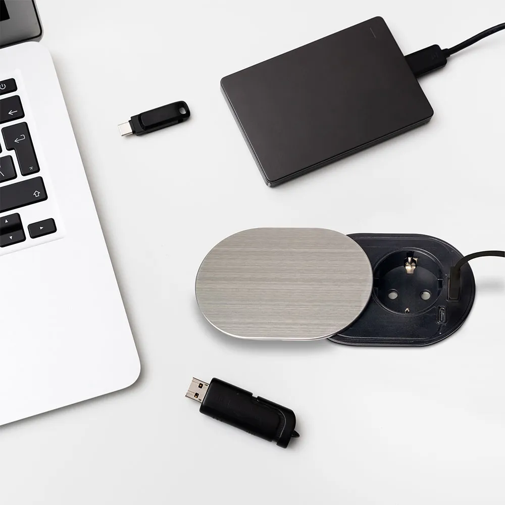 Diese Steckdosenleiste verfügt über eine Schuko-Steckdose Typ F (EU) und USB-Anschlüsse zum Aufladen elektronischer Geräte. Die Steckdose und der USB-Anschluss sind hinter einer extraflachen Abdeckung aus Edelstahl verborgen, die für den Zugriff zur Seite geschoben werden kann.