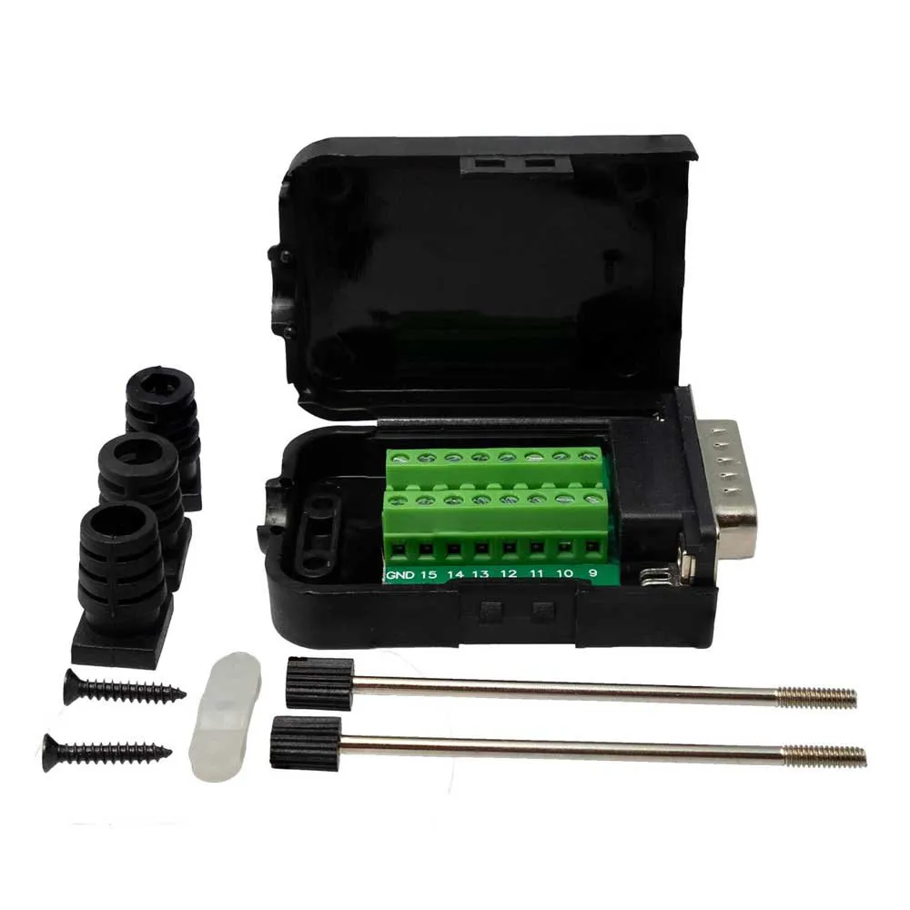 Dieser hochwertige DB15-Stecker mit Klemmen ermöglicht die manuelle Verbindung von Kabel und Stecker und bietet eine sichere und zuverlässige Verbindung für Ihre Daten- und Steuerungsanwendungen. Das Herzstück seines Designs ist der benutzerfreundliche Klemmenblock, bei dem jeder der 15 Pins eindeutig einer einzelnen Schraubklemme zugeordnet ist. Dieses intuitive Layout vereinfacht den Verdrahtungsprozess: Einfach die Drähte abisolieren, in die entsprechende Klemme einführen und die Schraube festziehen, um eine solide und stabile elektrische Verbindung herzustellen. Diese lötfreie Methode ist nicht nur schneller, sondern ermöglicht auch eine einfache Demontage und Neuverdrahtung, was sie perfekt für Projekte macht, die zukünftige Änderungen erfordern könnten.
