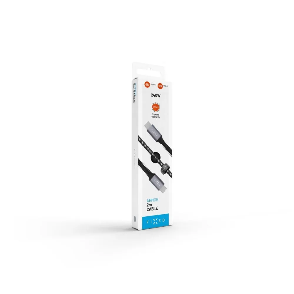 Das Premium-Kabel FIXED aus der ARMOR-Serie ist ein hochbeständiges Strom- und Datenkabel, das dank seiner Eigenschaften um ein Vielfaches länger hält als gewöhnliche Kabel. Die Enden der Stecker sind in der Regel der am stärksten beanspruchte Teil des Kabels, und die meisten Kabel brechen schnell. Das Armor-Kabel hat diesen Teil mit einer schützenden Rippenstruktur verstärkt, die bis zu 150.000 Biegungen getestet wurde, um eine langfristige Nutzung zu gewährleisten. Die Widerstandsfähigkeit des Kabels wird durch eine hochwertige Nylonummantelung erhöht, die zusammen mit verzinkten Enden in der Farbe Space Gray mit einer Reihe moderner Elektronik harmoniert. Zum Laden bietet es eine überdurchschnittliche Leistung von bis zu 240 W mit Unterstützung für Power Delivery 3.1 Schnellladung und ermöglicht gleichzeitig die Datenübertragung mit einer Geschwindigkeit von 480 Mbit/s im USB 2.0 Standard. Im Lieferumfang finden Sie außerdem ein praktisches Klettverschlussband zur einfachen Kabelaufbewahrung und einen selbstklebenden Organizer, mit dem Sie das Kabel an der gewünschten Stelle befestigen können.