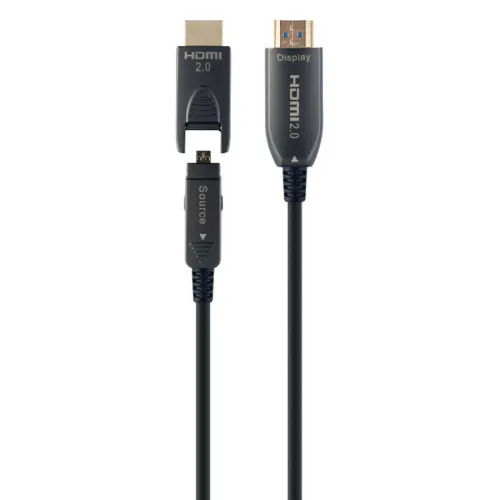 - HDMI Active Optical Cable (AOC) verwendet eine Glasfasertechnologie, um das digitale HDMI-Signal zu übertragen. Das bedeutet, dass das Signal viel weiter übertragen werden kann als mit einem herkömmlichen Kupferkabel (bis zu 100 m) und das Risiko von EMI/RFI-Interferenzen reduziert wird. HDMI AOC-Kabel haben außerdem dedizierte Kupfer-Stromkabel im Inneren, sodass keine externe Stromversorgung erforderlich ist.