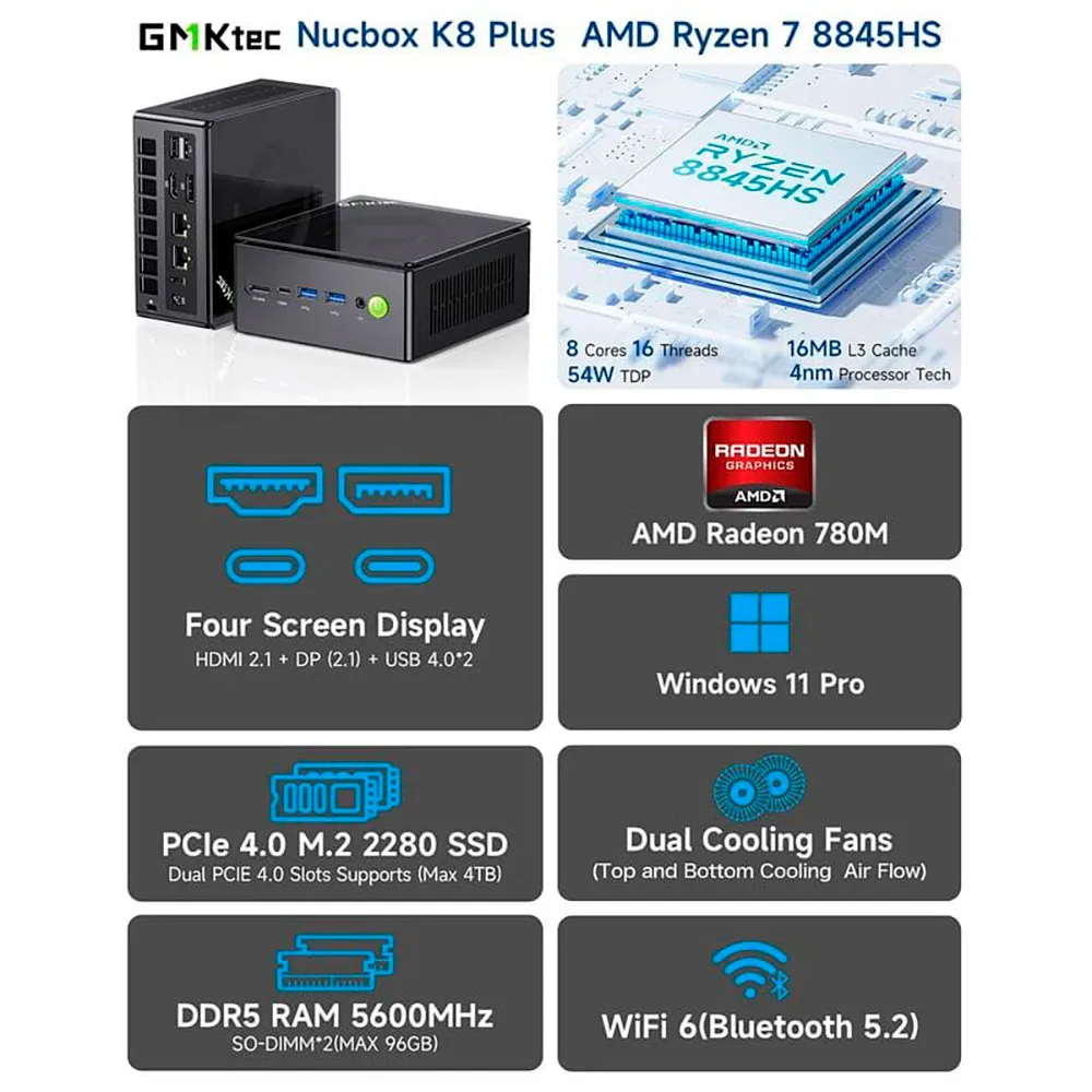 Der GMKtec NucBox K8 Plus ist für die Verwendung mit Videospielen und leistungsstarken Anwendungen konzipiert, da er über einen effizienten AMD Ryzen 7-8845HS Prozessor mit 12 Kernen und eine AMD Radeon 780M GPU verfügt.