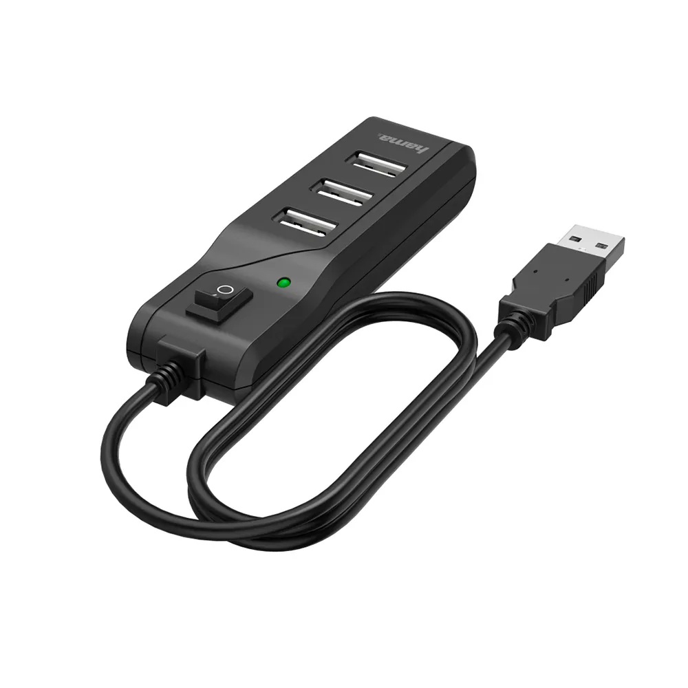 Ein Hub mit 4 USB-Anschlüssen und einem Schalter, perfekt zum Anschließen eines PCs, Laptops, MacBooks, eines Tablets mit USB-Stick, einer Maus, einer Tastatur oder eines Druckers.