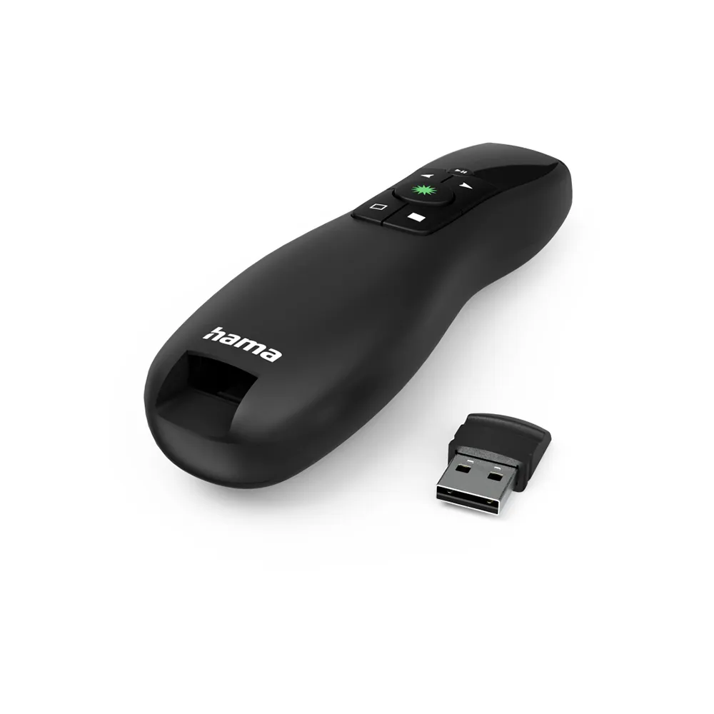 Als einer der vielseitigsten verfügbaren Pointer ist der HAMA Greenlight auf Komfort und Zuverlässigkeit ausgelegt. Seine 2.4-GHz-Funktechnologie bietet eine stabile und störungsfreie Verbindung über bis zu 15 Meter, was Ihnen die Freiheit gibt, sich im Raum zu bewegen, mit Ihrem Publikum zu interagieren und aus jedem Winkel zu präsentieren. Die Einrichtung ist dank der Plug & Play-Funktionalität mühelos; schließen Sie einfach den kompakten USB-Empfänger an Ihren Computer an, und schon können Sie loslegen – keine Softwareinstallation erforderlich. Wenn Sie fertig sind, lässt sich der USB-Empfänger clever im Gehäuse des Presenters verstauen, was Verlust verhindert und sicherstellt, dass er immer für Ihren nächsten Einsatz bereit ist. Das ergonomische Design und die Soft-Touch-Oberfläche sorgen für einen bequemen und sicheren Halt über Stunden hinweg.
