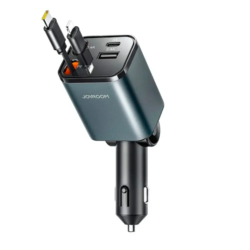 Dieses kompakte Joyroom Autoladegerät bietet bis zu 65W Leistung über mehrere Anschlüsse, die in ein einzelnes 80cm langes, einziehbares Kabel integriert sind (mit USB-C, Lightning, Micro-USB und USB-A), kompatibel mit PD, QC 3.0 und PPS.