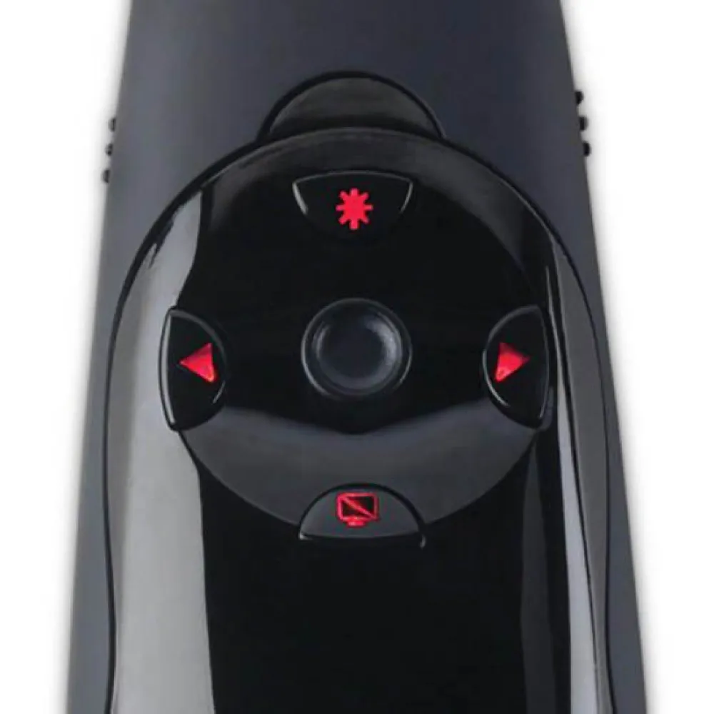 Steuerelemente mit beleuchteten Tasten Verschieben Sie die Folien vorwärts / rückwärts, verdunkeln Sie den Bildschirm und aktivieren Sie den roten Laserzeiger