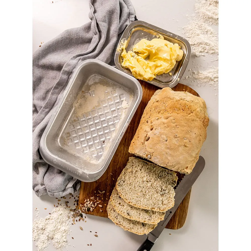 Mit nachhaltigem Design im Mittelpunkt der Backwarenserie ist diese rechteckige 2-Pfund-Kastenform aus recyceltem Aluminium gefertigt.