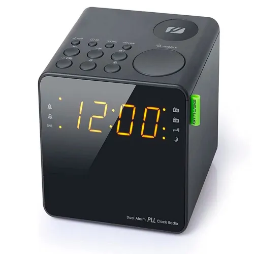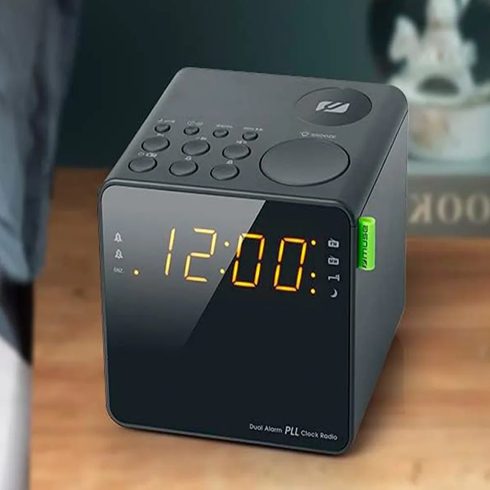 MUSE M-187 CR Radiowecker in Schwarz mit UKW/MW PLL-Tuner, Dual-Alarm, 3.5-mm-Klinkenanschluss, 0.9-Zoll-Weißlicht-LED, 24-Stunden-Uhr, Betrieb mit AAA-Batterien.