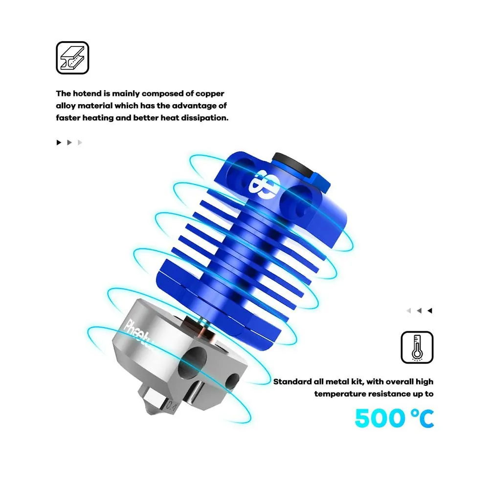 - Der Hotend besteht hauptsächlich aus einer Kupferlegierung, was den Vorteil einer schnelleren Erwärmung und besseren Wärmeableitung bietet.