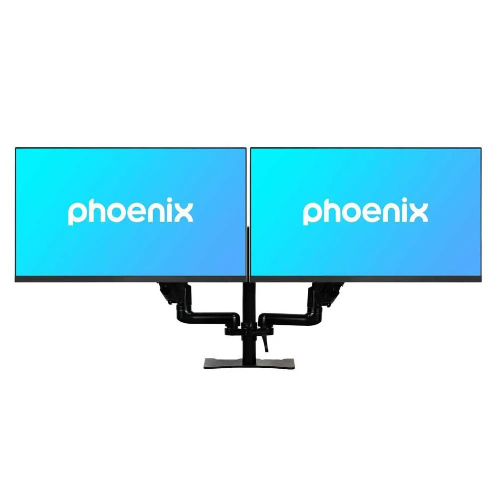 Montieren Sie zwei Monitore schnell und einfach mit dem Phoenix Dual Arm Mount. Hergestellt aus Aluminium und Stahl für mehr Haltbarkeit und Sicherheit -