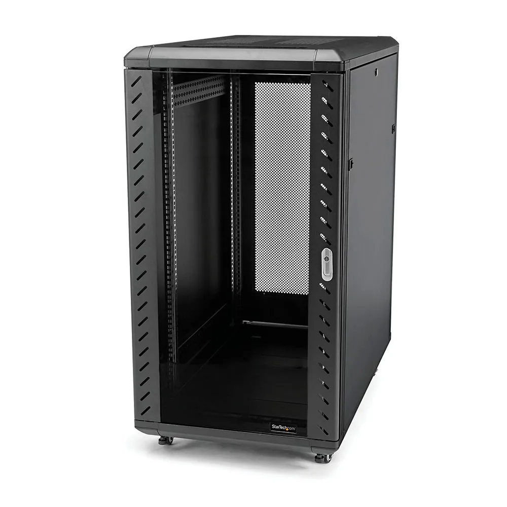 Dieser 18U-Serverschrank bietet reichlich Stauraum in einem eleganten, sicheren Schrank zur Aufbewahrung von EIA-310-konformen 19-Zoll-Rackmount-Geräten wie Dell-, HP- und IBM-Servern sowie Telekommunikations-, A/V- und IT-Geräten.