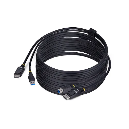 Kombinieren Sie eine DisplayPort 4K 60Hz- und eine USB 5Gbps-Verbindung in einem einzigen Kabel, um einen Computer mit einem KVM-Switch zu verbinden. Das KVM-Kabel bietet eine zuverlässige Verbindung zwischen einem Computer und einem DisplayPort-KVM-Switch mit USB 5Gbps-Unterstützung. Vereinfachen Sie das Kabelmanagement, indem Sie mehrere Verbindungen in einem einzigen Bündel zusammenfassen. Dies minimiert die Anzahl der einzelnen Kabel, die gehandhabt werden müssen, wodurch die Installation schneller und effizienter wird. Sie sind perfekt für Umgebungen, in denen KVMs unerlässlich sind, wie z. B. Rechenzentren, Serverräume, Edge-Networking und Remote-Management-Setups, und tragen dazu bei, Kabelgewirr zu reduzieren und einen organisierten Arbeitsbereich aufrechtzuerhalten. Funktioniert mit jedem KVM-Switch. Dieses KVM-Kabel funktioniert mit jedem Betriebssystem, einschließlich Windows, macOS, ChromeOS und Linux. Es unterstützt auch alle wichtigen Hardwareplattformen wie Intel, AMD und Apple Silicon. Das KVM-Kombikabel ist DisplayPort 1.2-konform und unterstützt Auflösungen bis zu 4K bei 60 Hz, HDR10 und DisplayPort-Audio für ein hochwertiges Audio-/Videoerlebnis. Der USB 3.0 Typ-A-zu-Typ-B-Anschluss bietet schnelle Datenübertragungsgeschwindigkeiten von bis zu 5 Gbit/s. Der Vorteil: 3 m (10 ft) DisplayPort- und USB 5Gbps-KVM-Kabel, 4K 60Hz, Universell kompatibles DP 1.2/USB 3.0-Kombikabel für KVM-Switches. Kabellänge: 3.1 m, Tastaturanschlusstyp: USB, Mausanschlusstyp: USB. Konformitätszertifikate: RoHS. Menge pro Packung: 1 Stück(e), Verpackungsbreite: 395 mm, Verpackungstiefe: 138 mm. Breite des Master-Kartons (außen): 400 mm, Länge des Master-Kartons (außen): 300 mm, Höhe des Master-Kartons (außen): 300 mm. KVM-KOMBIKABEL: Verbinden Sie einen Computer mit einem DisplayPort-KVM-Switch, der über USB 5Gbps verfügt.