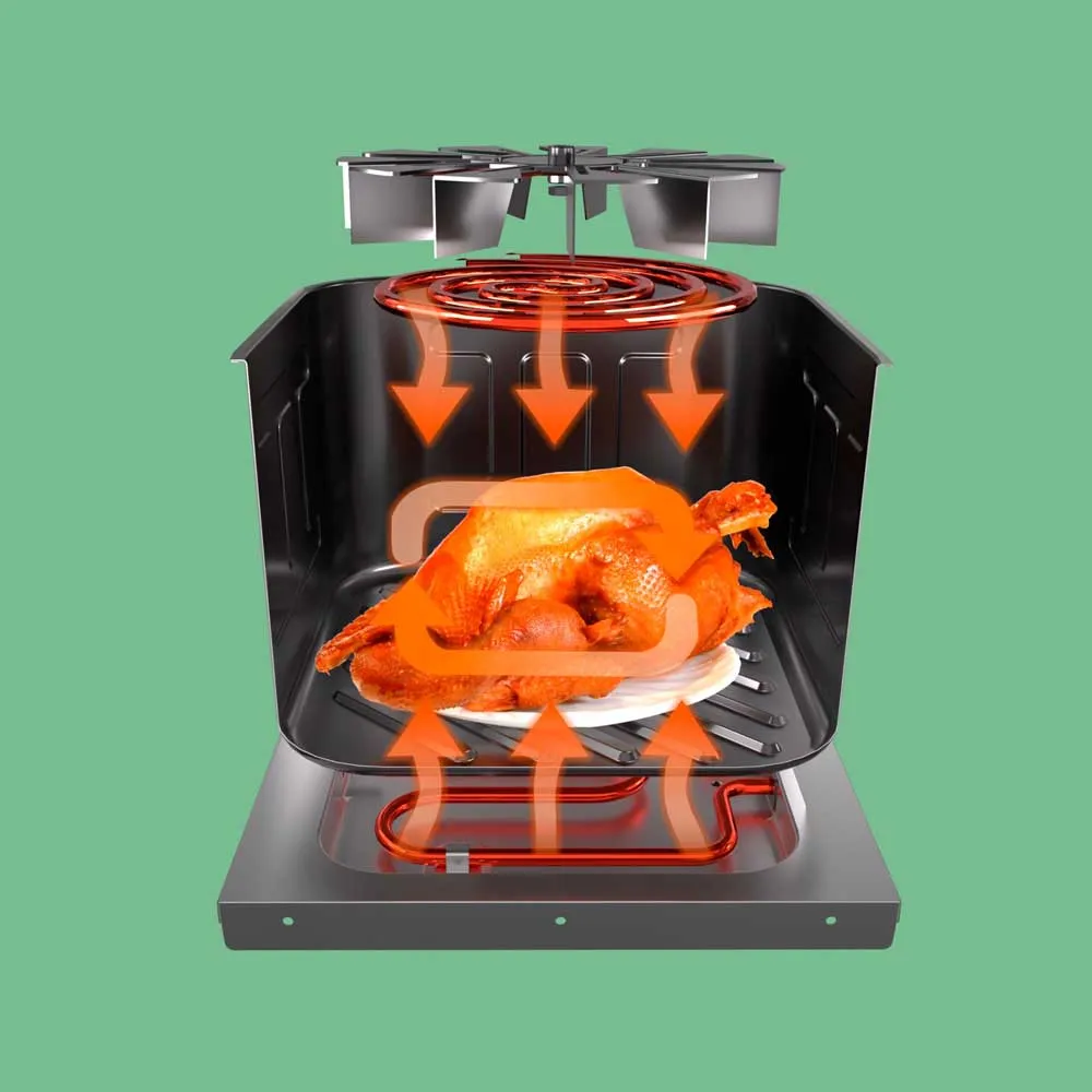 Dieses leistungsstarke System umhüllt Ihre Speisen mit schnell zirkulierender Heißluft, gart sie perfekt und erzeugt die unwiderstehliche goldbraune, knusprige Textur, die Sie lieben – und das alles mit bis zu 90 % weniger Fett als bei herkömmlichen Frittiermethoden.