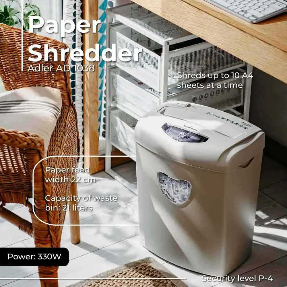 The Adler AD 1038 is a high-performance document shredder designed for safe and efficient destruction of confidential materials.