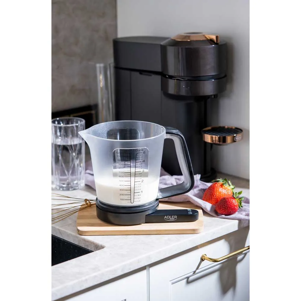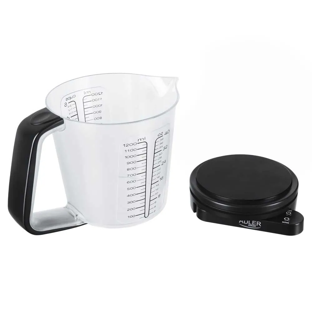 Electronic kitchen scale with a maximum capacity of 5 kg and an accuracy of 1 g. Extremely helpful when preparing dishes that require strictly defined proportions of products. It allows for precise weighing of even small amounts of products. It also meets the needs of people who care about the size of their meals for health reasons. Thanks to its small size, the scale is convenient to store and enables efficient carrying. It has a removable cup and a large retractable display. Aesthetic and transparent mug with a capacity of 1200 ml is easy to keep clean. In addition, the scale has a tare function and is equipped with non-slip feet.