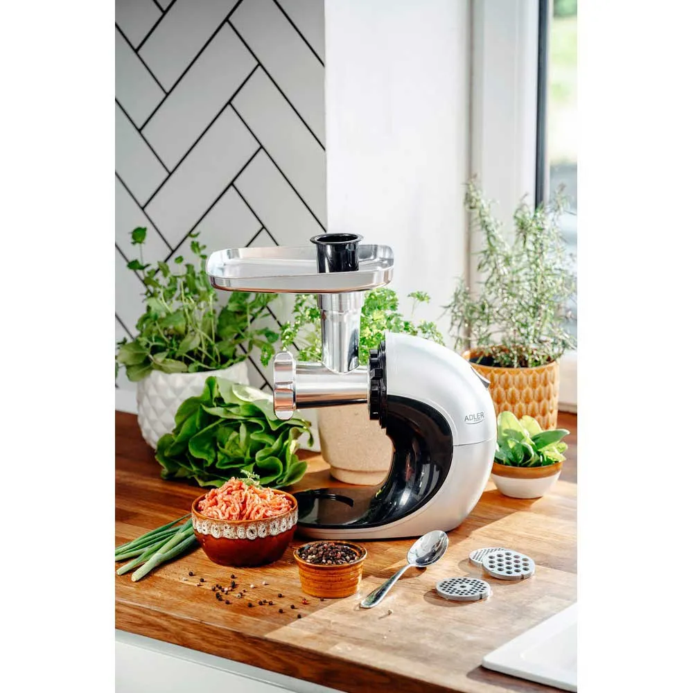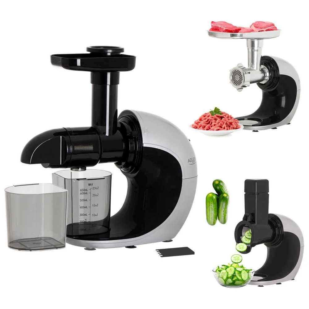 Multifunctionality and Compactness:- Discover the versatility of the kitchen with the Adler AD 4131, a 3-in-1 appliance that combines a slow juicer, meat grinder, and vegetable slicer.