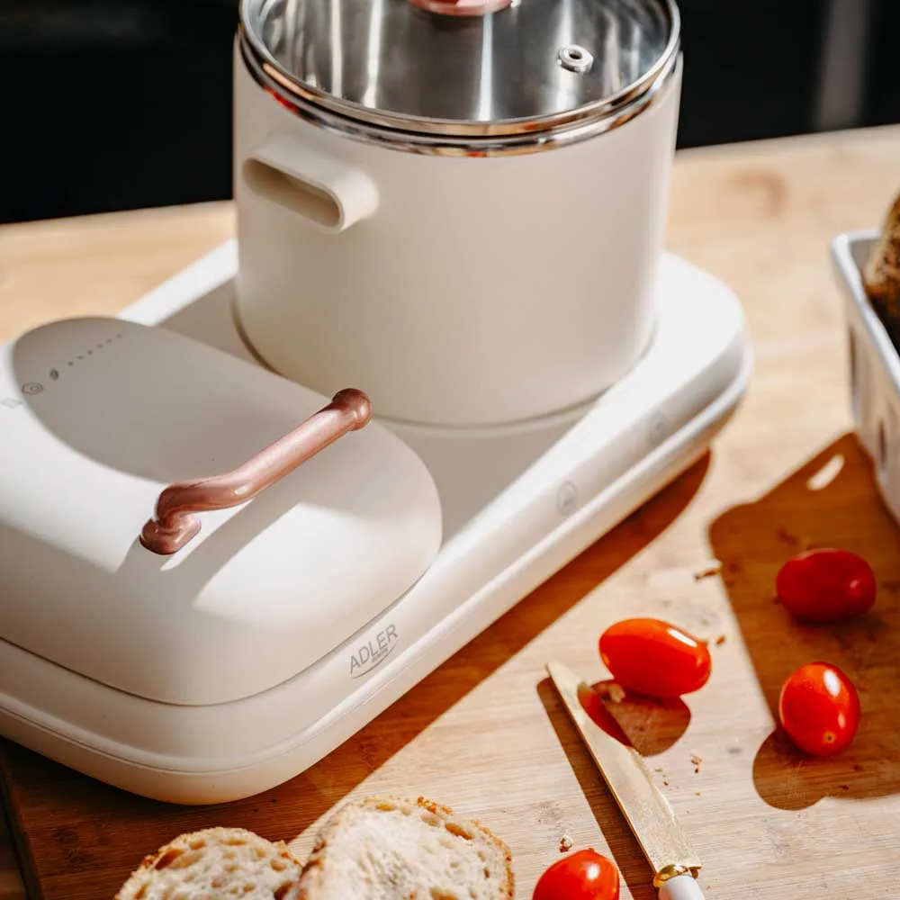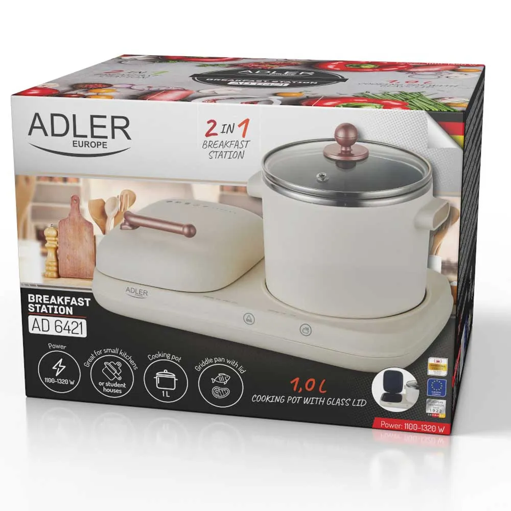 he Adler AD 6421 2-in-1 Breakfast Station combines functionality and retro charm in a compact, cream-colored design, perfect for any kitchen. Whether you’re preparing breakfast or looking for a versatile appliance for a small kitchen, this breakfast station is the ideal choice.