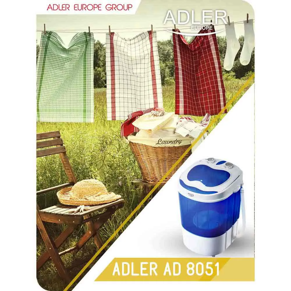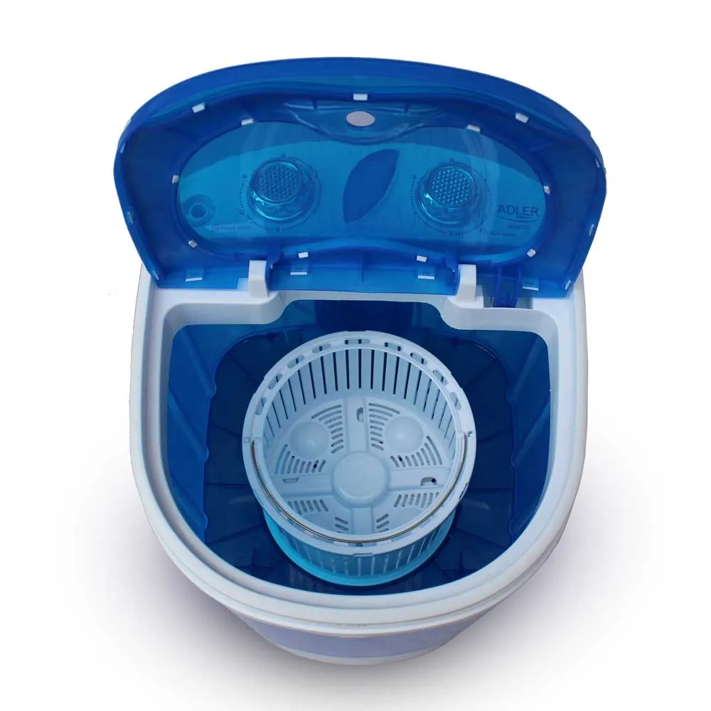 Meet the ADLER AD 8051, the compact washing machine for life on the go! Perfect for small apartments, camping trips, or when your main washer is down, this lightweight top-loader is your ideal laundry solution. It efficiently washes up to 3kg of clothes, including delicates, in a quick 15-minute cycle, saving water and energy. It also features a separate spin function for up to 1kg of laundry to speed up drying. Easy to use, transport, and store, it offers ultimate convenience wherever you are. EU Plug