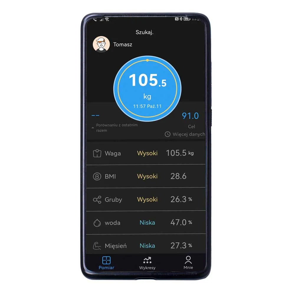 - 12 health parameters: Track essential data (weight, BMI, body fat, water content, muscle mass, bone mass) as well as advanced metrics such as visceral fat, protein levels, metabolic age, BMR, and more.