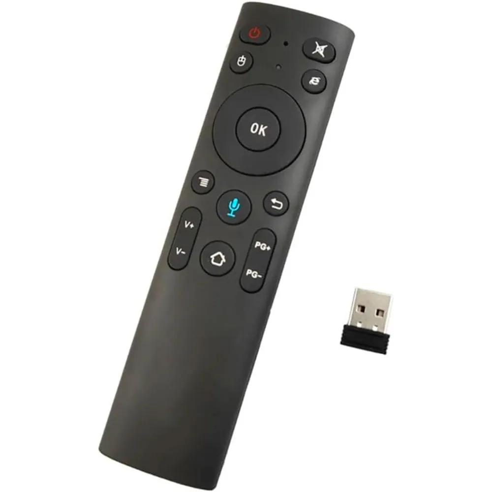 Bluetooth and 2.4G Connectivity - Transmission up to 15 meters - Compatibility with Smart TV, Android TV Box and mini PCs - Voice control - Works with two AAA batteries - Made of black plastic - Includes USB receiver.