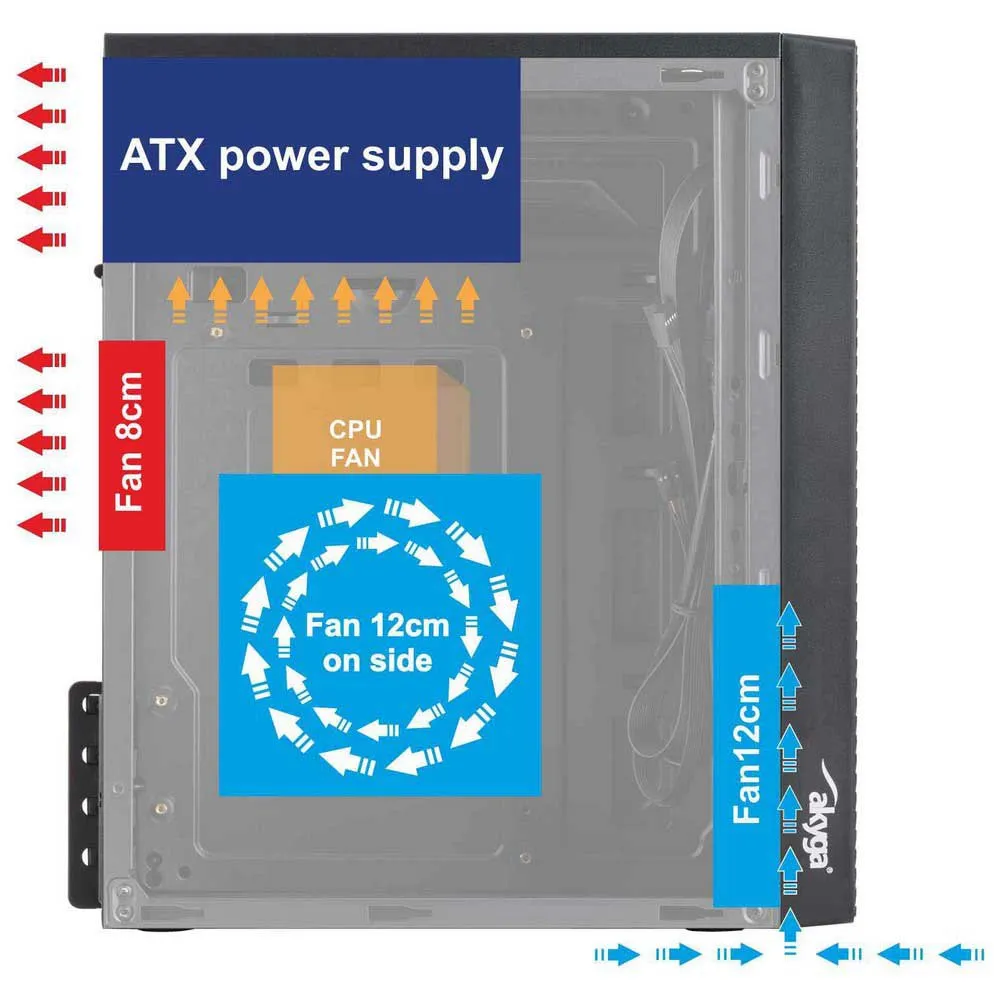 - Fan slots description:Side: 12cm, back: 8cm, front: 12cm