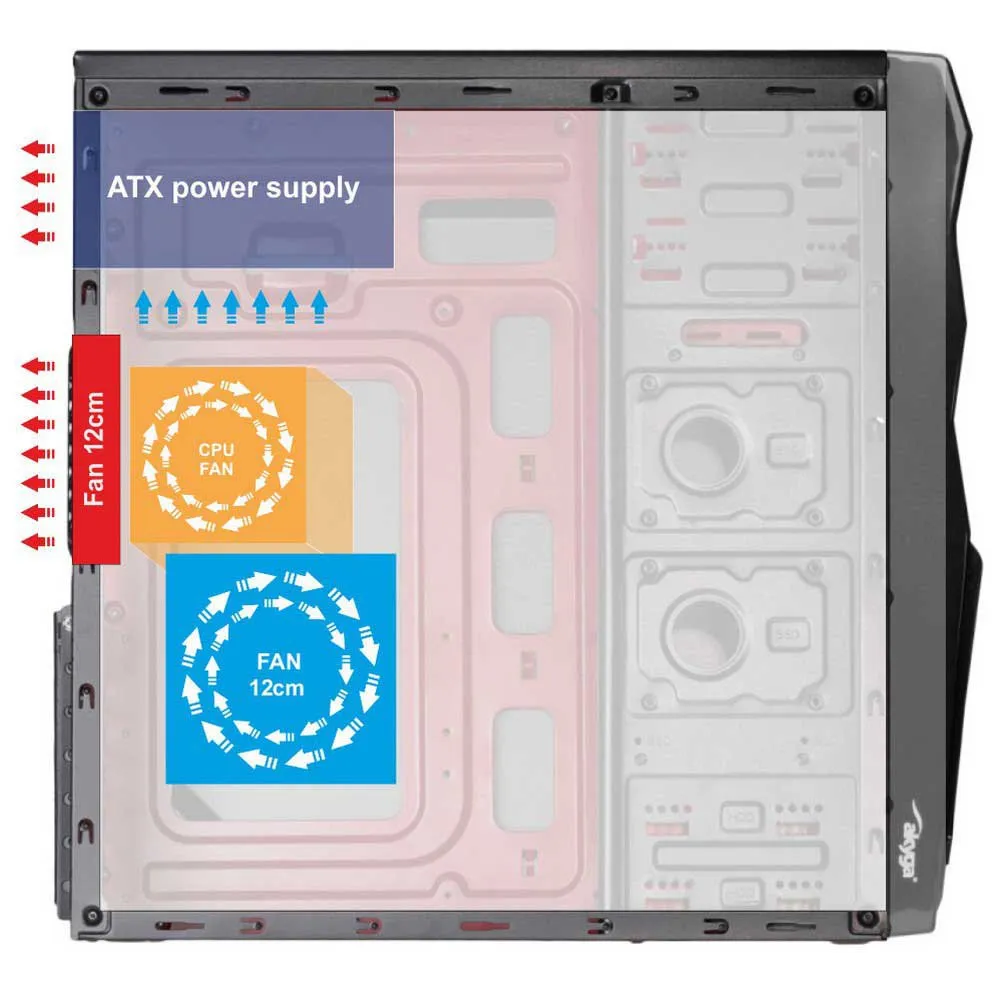 The Akyga® AK939BL is a Midi ATX case, suitable for players as well as home or office space. The case fit Micro ATX, Mini ITX, Flex ATX or standard ATX motherboard. Located on the top 5.25´´ external bay allow to mount a CD/DVD drive or burner. Inside there are three 2.5´´ bays, three 3.5” bays (convertible to 2.5´´) and one 5.25” bay, giving a total of 7 bays for disks and drives. The cable management system facilitate the installation of components while spacious interior allows for long graphics cards up to 385 mm long. The case makes it possible to install two fans: side (12 cm) and rear (12 cm). The maximum height of CPU cooling system is 150 mm. On the front panel there are two USB 2.0 which are great for connecting wireless mice, keyboards, external storage media or other devices. The headphone and microphone inputs are located right next to, providing fast and easy access for peripherals.