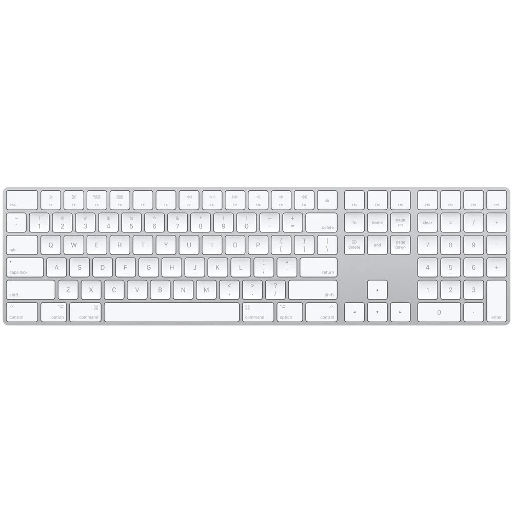 Magic Keyboard with Numeric Keypad features an extended layout, with document navigation controls for quick scrolling and full-size arrow keys for gaming. A scissor mechanism beneath each key allows for increased stability, while optimised key travel and a low profile provide a comfortable and precise typing experience. The numeric keypad is also great for spreadsheets and finance applications. And the built-in, rechargeable battery is incredibly long-lasting, powering your keyboard for about a month or more between charges.